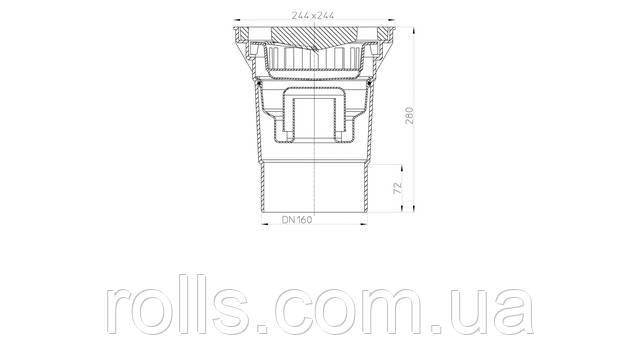 Дворовий трап серії Perfekt DN160 вертикальний з підрамниками з ПП 244 х 244 мм, решіткою з чавуну 226 х 226 мм, пісковловлювачем і водяним затвором.