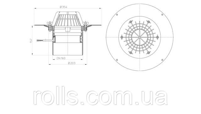 Лійка для плоских покрівель DN160 вертикальний випуск з електропідігрівом від мережі напругою 230В, потужністю 10-30Вт, з обтискним фланцем і затискним з нержавіючої сталі для прикріплення ущільнюючих плівок, з листовловлювачем d 180 мм. Будівельний захист під час монтажу у комплекті.