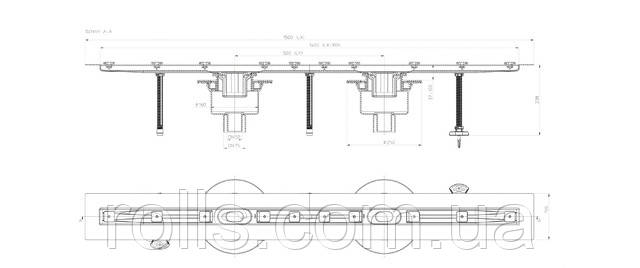 Вертикальний душовий лоток для лінійного відведення води, без решітки, складається з корпусу з нержавіючої сталі з фланцем для гідроізоляції (корпус з ефектом самоочищення через внутрішній нахил), вертикального випуску з ПП DN50/75 (2шт) з сифоном, що виймається, 6-и регульованих по висоті монтажних ніжок, двох шаблонів для монтажу плитки. Довжина корпусу 1500 мм. Пропускна спроможність 1,4 л/с.